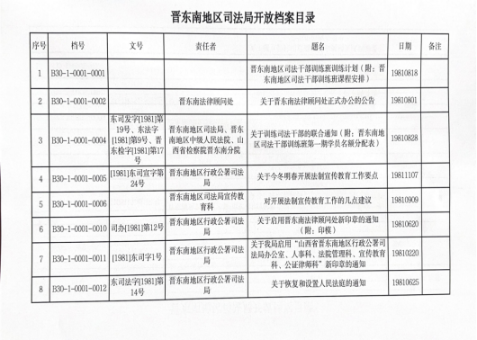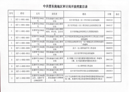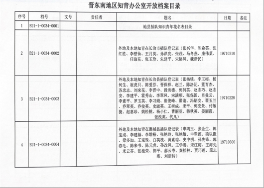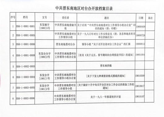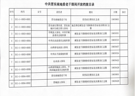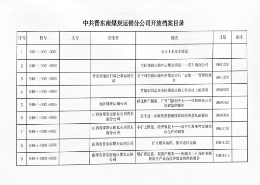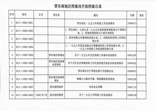 本次开放档案涉及16个全宗,共开放8618件,分别为中共晋东南地委政法委员会、中共晋东南地委老干部局、晋东南地区档案局、晋东南地区农业委员会、晋东南地区财贸办公室、晋东南地区知青办公室、晋东南地区工商局、晋东南地区审计局、晋东南地区司法局、晋东南地区物资局、山西省煤炭运销总公司晋东南分公司、晋东南地区文联、中共晋东南地区对台办、晋东南地区广播事业局、晋东南地区电大工作站、晋东南地区体委,均形成于1950年至1985年。其中中共晋东南地委政法委员会全宗开放159件;中共晋东南地委老干部局全宗开放198件;晋东南地区档案局全宗开放1654件;晋东南地区农业委员会全宗开放293件;晋东南地区财贸办公室全宗开放1571件;晋东南地区知青办公室全宗开放1402件;晋东南地区工商局全宗开放1443件;晋东南地区审计局全宗开放29件;晋东南地区司法局全宗开放139件;晋东南地区物资局全宗开放582件;山西省煤炭运销总公司晋东南分公司全宗开放139件;晋东南地区文联全宗开放183件;中共晋东南地区对台办全宗开放118件;晋东南地区广播事业局全宗开放552件;晋东南地区电大工作站全宗开放28件;晋东南地区体委全宗开放128件。该批档案真实记录了晋东南地区政治建设、经济发展、文化教育等领域的历史全貌,既是党和政府科学决策、工作查考的重要凭证,也是研究晋城地方历史、传承地域文化的珍贵史料。